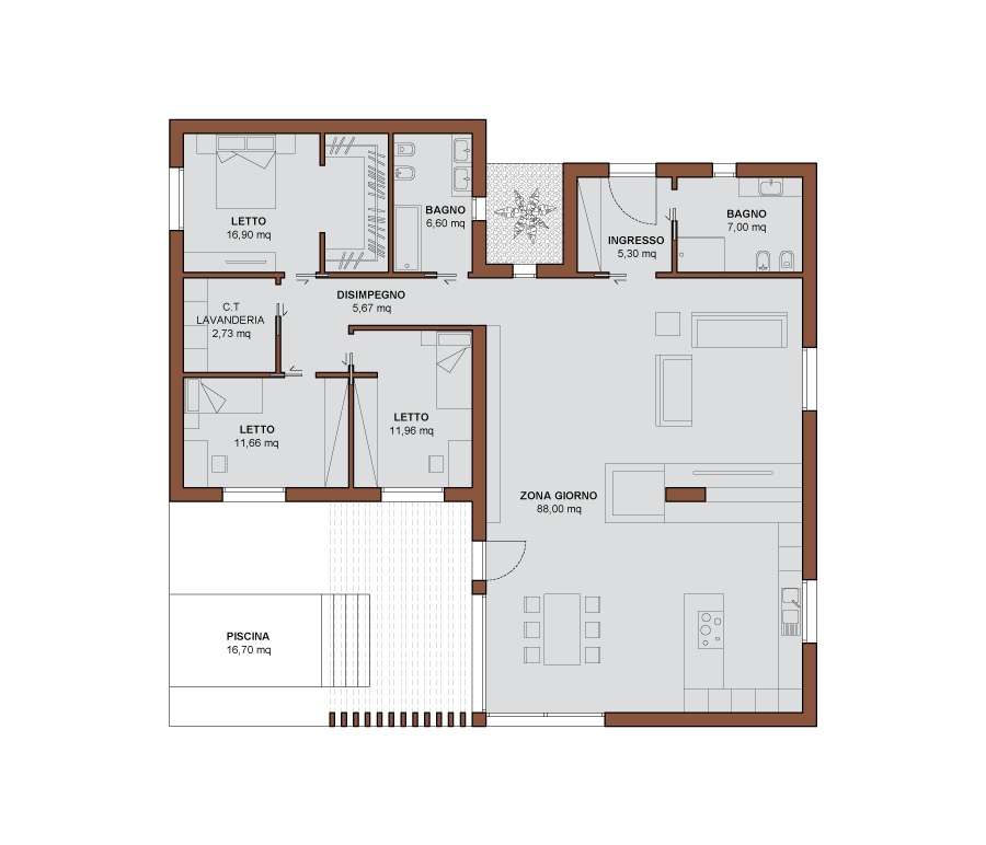 La zona giorno è caratterizzata da spazi ampi e luminosi, concepiti per essere vissuti in totale comodità. La zona notte, distribuita in modo ottimale, restituisce ambienti confortevoli e rilassanti. Relax che continua all’esterno nella zona piscina, disegnata per dialogare in maniera armonica con i volumi della casa.